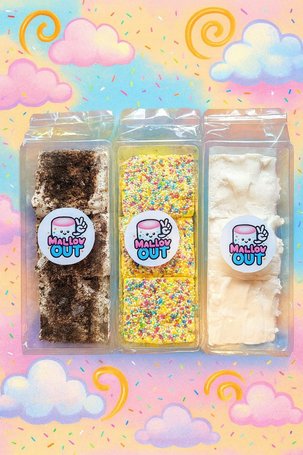 Welcome to Mallow Out, where we bring you the quirkiest, lightest, and fluffiest marshmallows, our famous cloud mallows! Born from our fifteen years of sweet success running a cupcake company—where we’ve baked for over four hundred celebrities—we’re thrilled to introduce our unique mallows that melt in your mouth. Dive into the cloud-like goodness!"